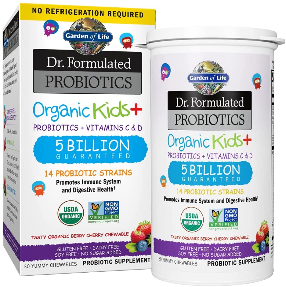 Dr. Formulated Probiotics Organic Kids+ is a great option, as it contains 10 different strains of probiotics, including Lactobacillus acidophilus and Bifidobacterium lactis.